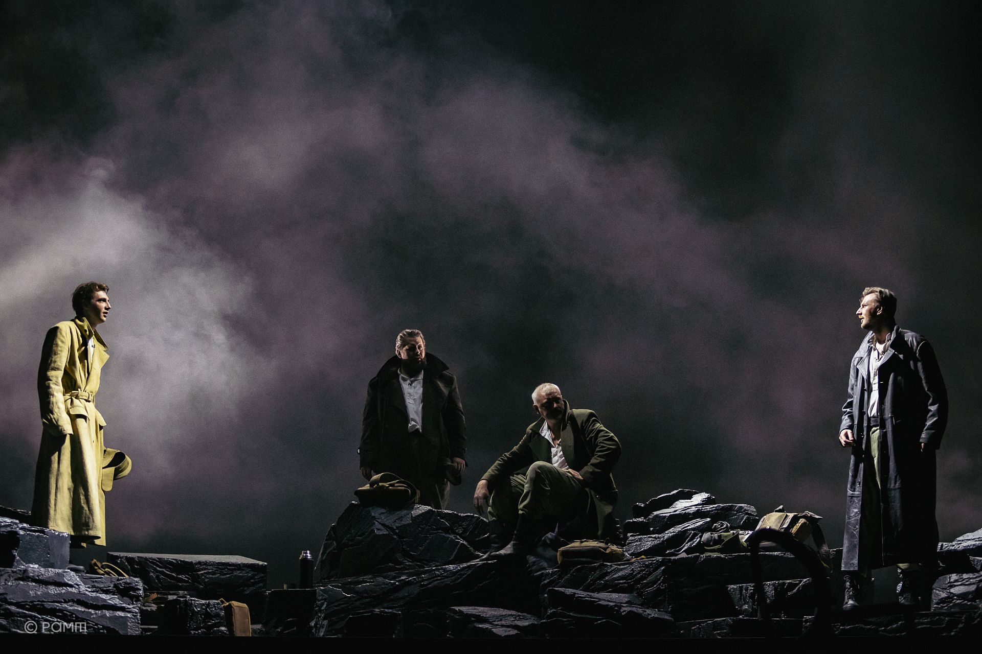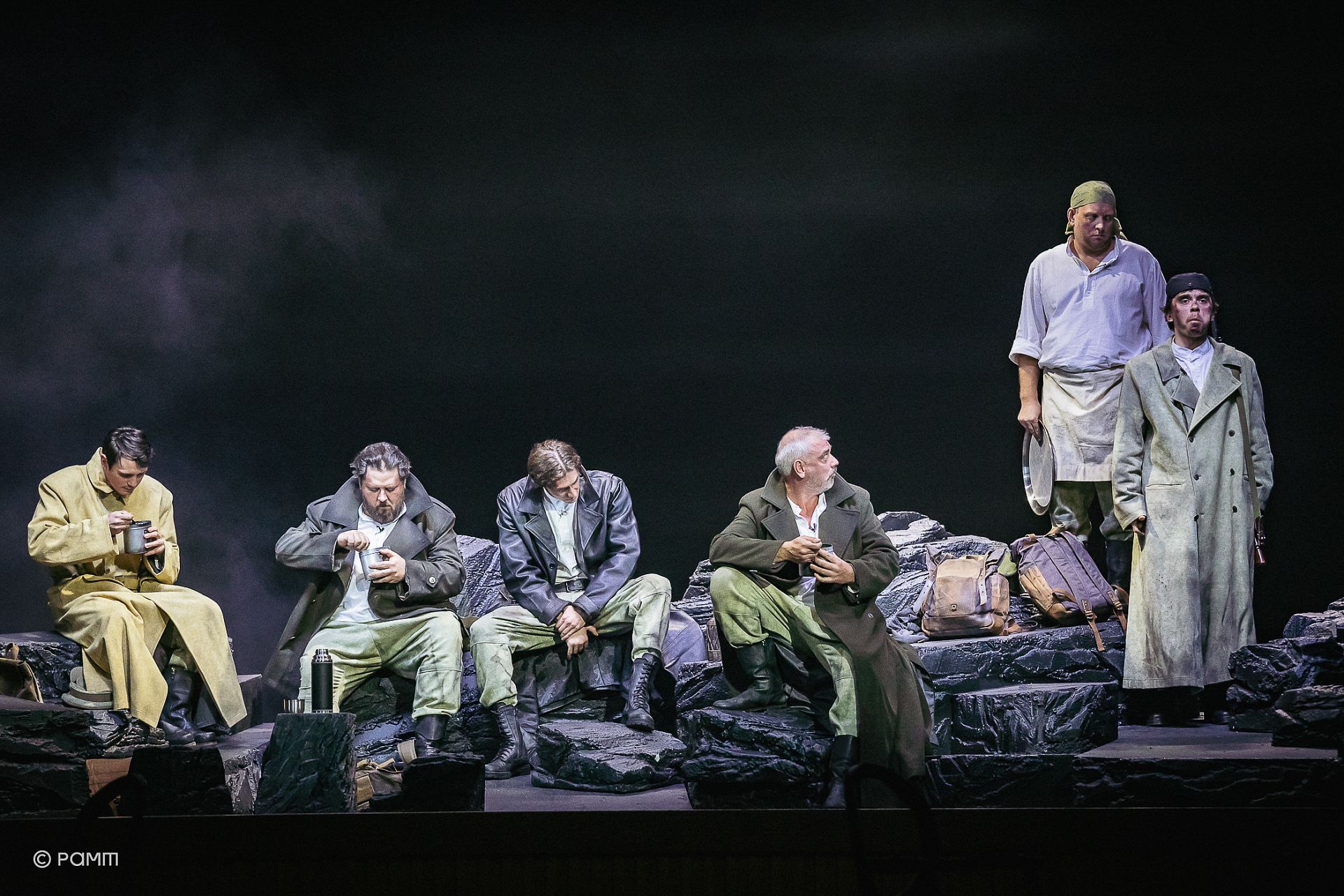 В пьесе Шерриффа сюжет помещен в блиндаж, который в пространстве спектакля вывернут наизнанку: вместо укрытия в земле, создающего ощущение безопасности – камни, разбросанные на манер античного амфитеатра, реализующие метафору «театра военных действий», за которым удобно наблюдать. Не случайно в сценах фарса военная история замирает и кажется лишь сюжетом картины.
