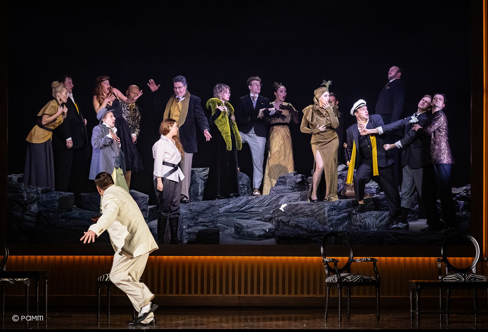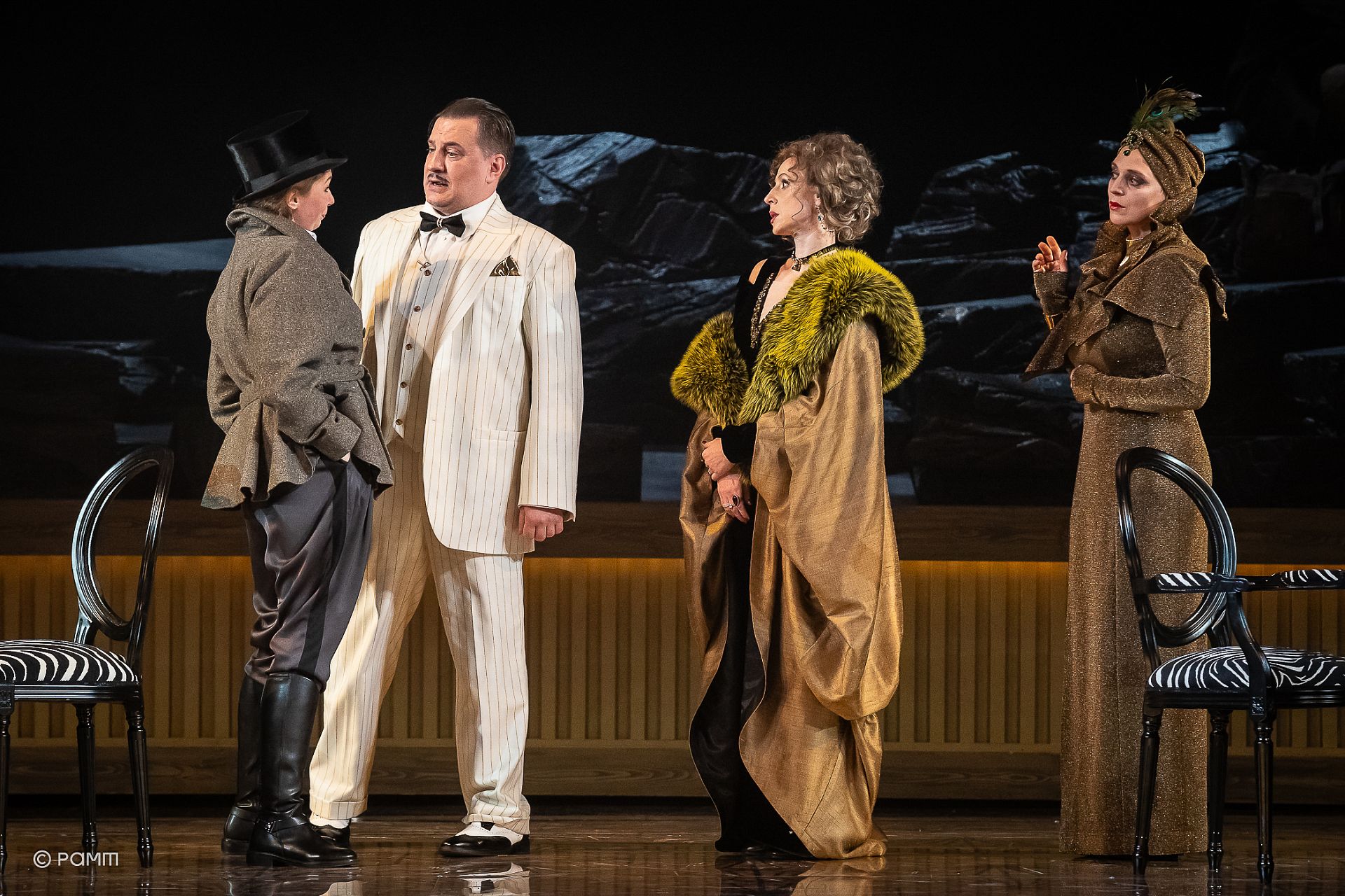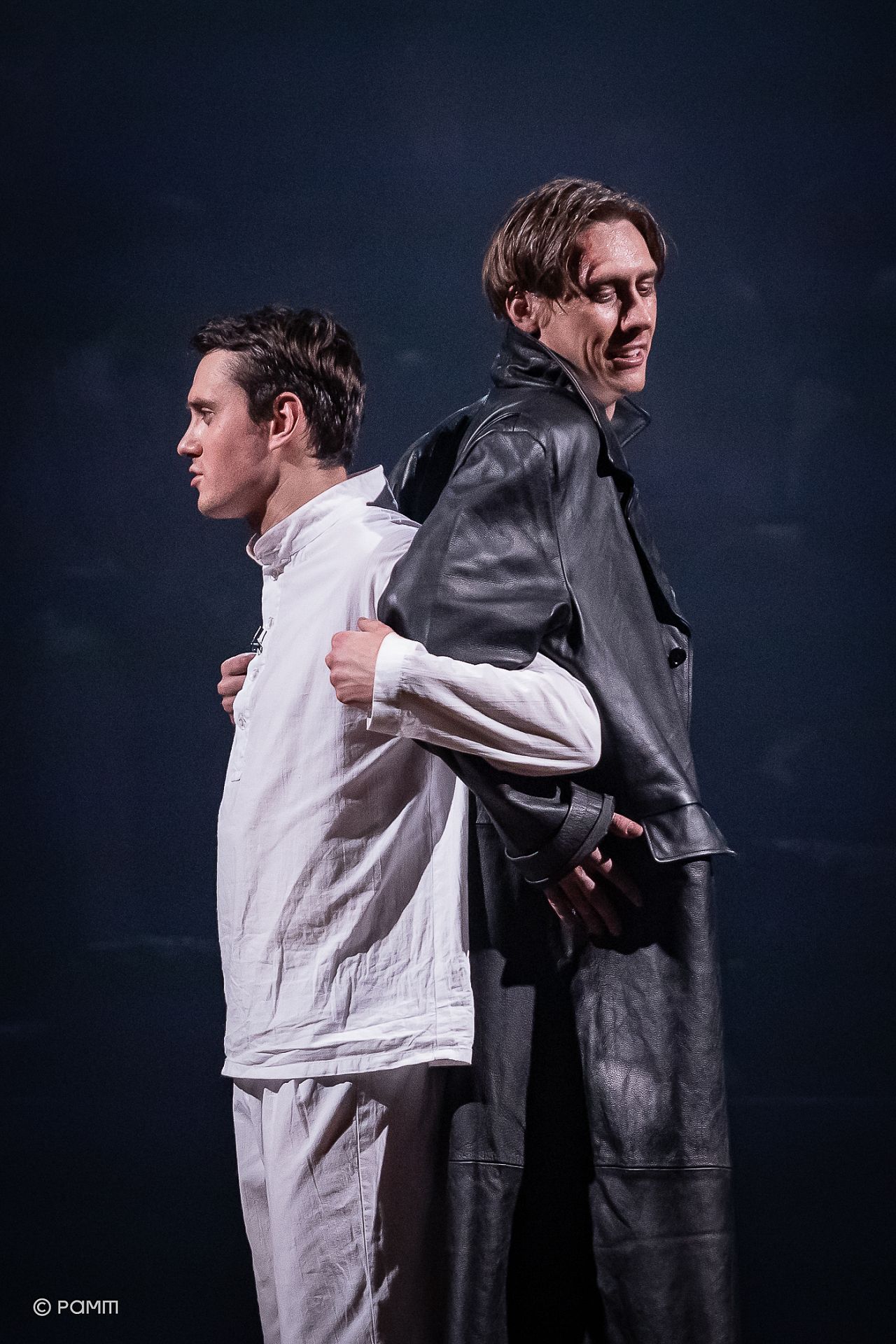 Мир фарса, наоборот, блестящий (пиджак доктора из Болоньи (Денис Баландин) сияет в прямом смысле слова благодаря гирлянде на его лацканах). Один костюм ярче и интереснее другого, и при этом кажется, что одежда говорит больше, чем сами люди – в наряде доньи Полишинель (Дарья Семенова) с роскошной меховой накидкой все кричит о богатстве ее мужа, а брюки Сильвии (Полина Каленова) показывают ее бунтарскую натуру. Но эти костюмы – все те же маски комедии дель арте, они прячут людей. В то время как герои мира войны готовы посмеяться над собой, персонажи фарса даже не осознают собственного комизма: Леандр, появившись на сцене уже в роли знатного господина, в косметической шапочке и халате выглядит всего лишь жалко и нелепо.