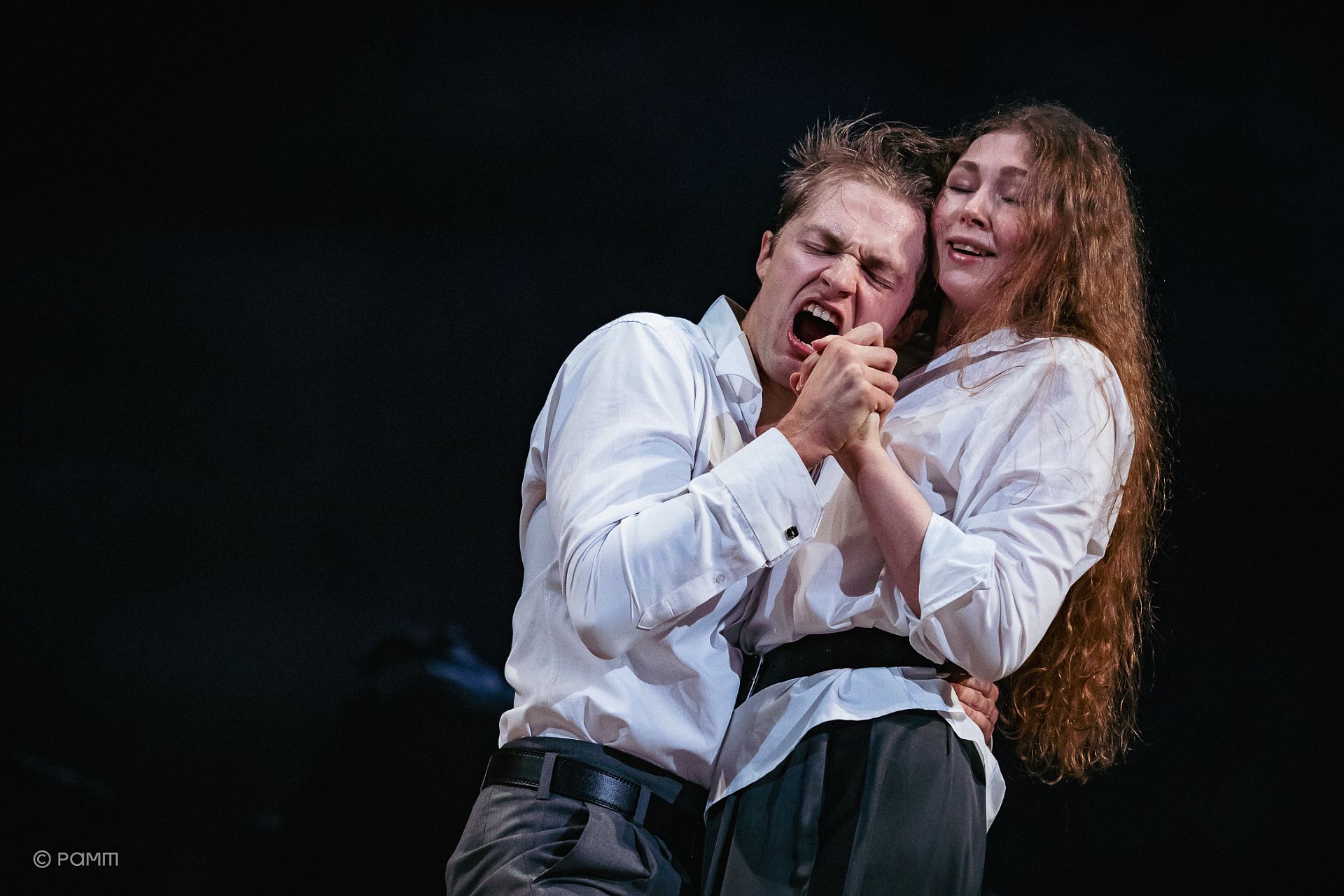 «Есть в этой жизни то, что остается, когда заканчивается этот фарс», – говорит Криспин, после чего герои Бенавенте перемещаются внутрь картинной рамы и застывают на групповом портрете, отыграв свои роли. Авансцену заполняют военные персонажи с короткими сообщениями о происходящем на передовой, среди которых – весть о ранении Рали. Стенхоуп приказывает принести его... В этой сцене их прощания Денис и его младший товарищ с перебитым позвоночником стоят спиной друг к другу, переплетя руки. Это похоже на вывернутые объятия (кажется, только такие и возможны в вывернутом мире), что отражает одновременно и огромную близость, и невозможность посмотреть друг другу в глаза. Стенхоуп значительно выше Рали, одет в черный кожаный плащ, Рали же – бос, в белой рубахе и напоминает ангела с перебитыми крыльями, что почти правда. Но сейчас они будто слились в одного человека и, кажется, единственное их отличие – во времени, отданном войне. Они двигаются очень медленно, по солнцу, по очереди оказываясь лицом к зрителю, и наконец говорят. Большая часть их фраз – бытовые, но в пространстве, полностью лишенном быта, они приобретают метафизическое звучание. В мире не остается ничего кроме их диалога. Неловкое, медленное кружение – это и есть конец пути. Вдруг Рали перестает отвечать и уходит с авансцены…