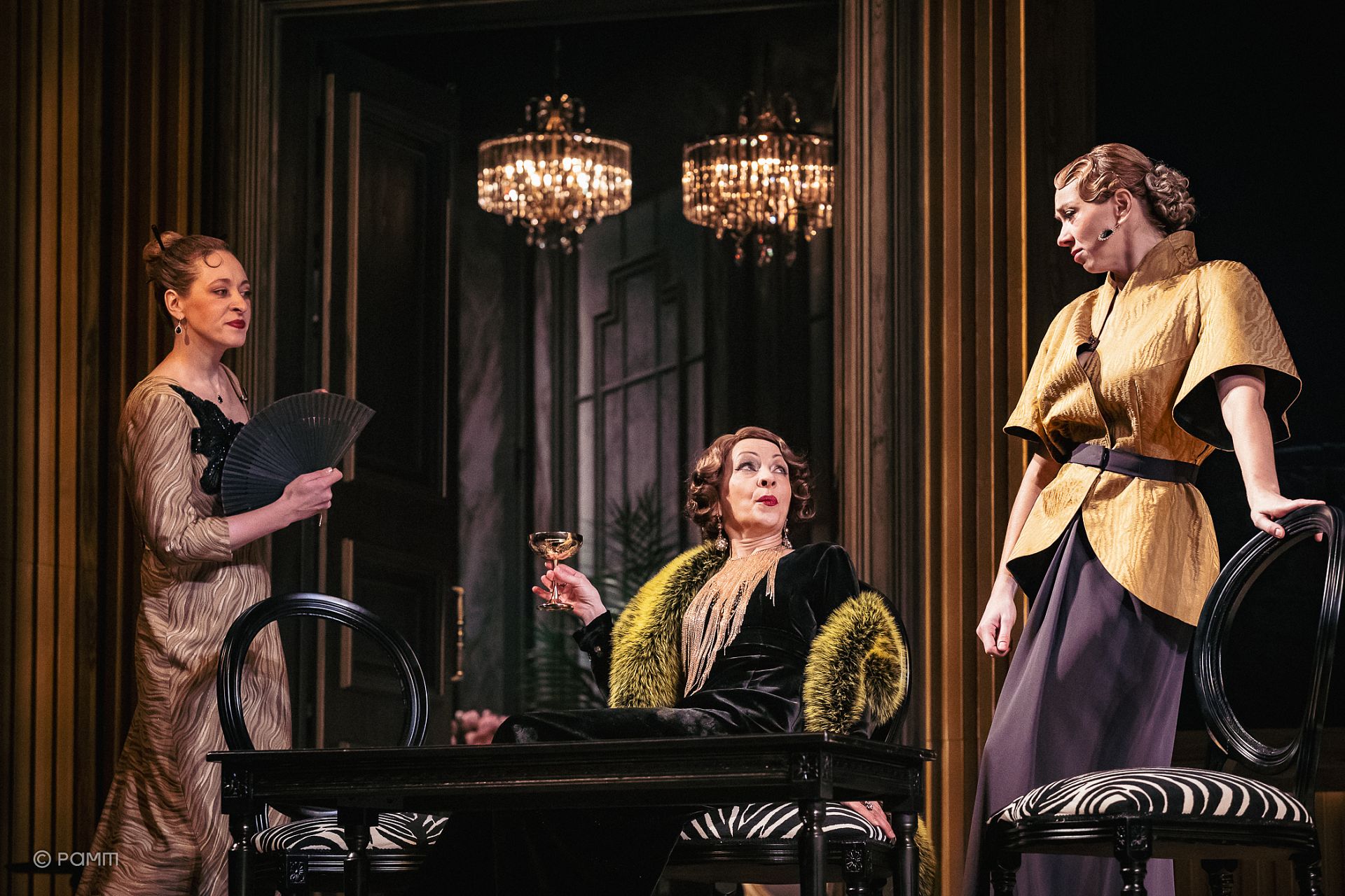 Фарсу принадлежит основная часть сцены и зрительный зал – именно из него появляются главные герои Леандр (Андрей Лаптев) и Криспин (Иван Юров). Действие разворачивается в большой гостиной, отделанной желтым мрамором, с безжизненно симметрично расставленной мебелью, двумя дверьми по бокам и картиной «Крушение» Томаса Коула в центре. С обстановкой и атмосферой мирной роскоши контрастирует мир войны, который пока скрыт за картиной-занавесом. Появившись же перед зрителями, он останется ограничен ее рамой – почти до конца.